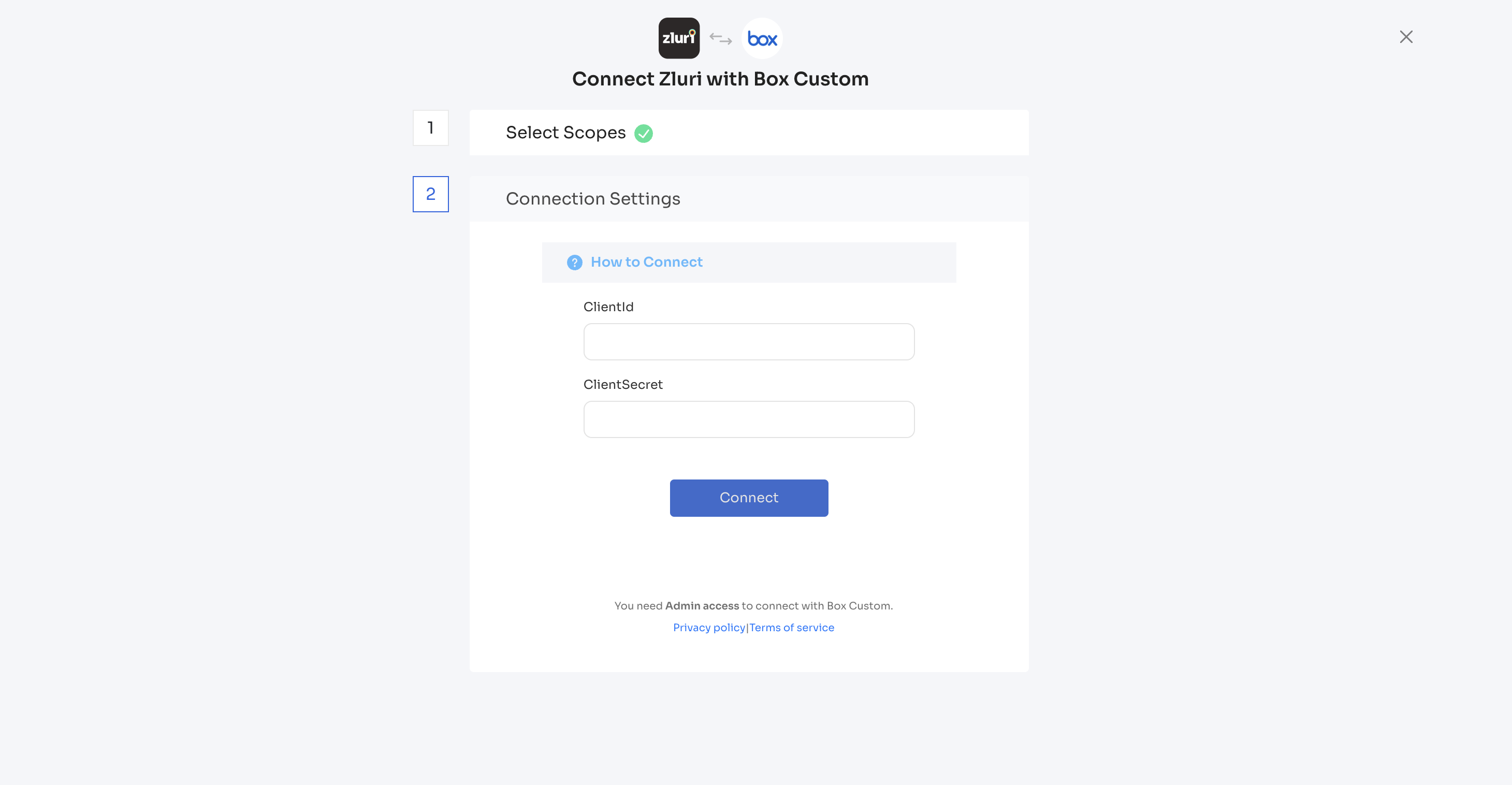 - Copy paste the Client ID and Client Secret and click on connect with selected scopes.