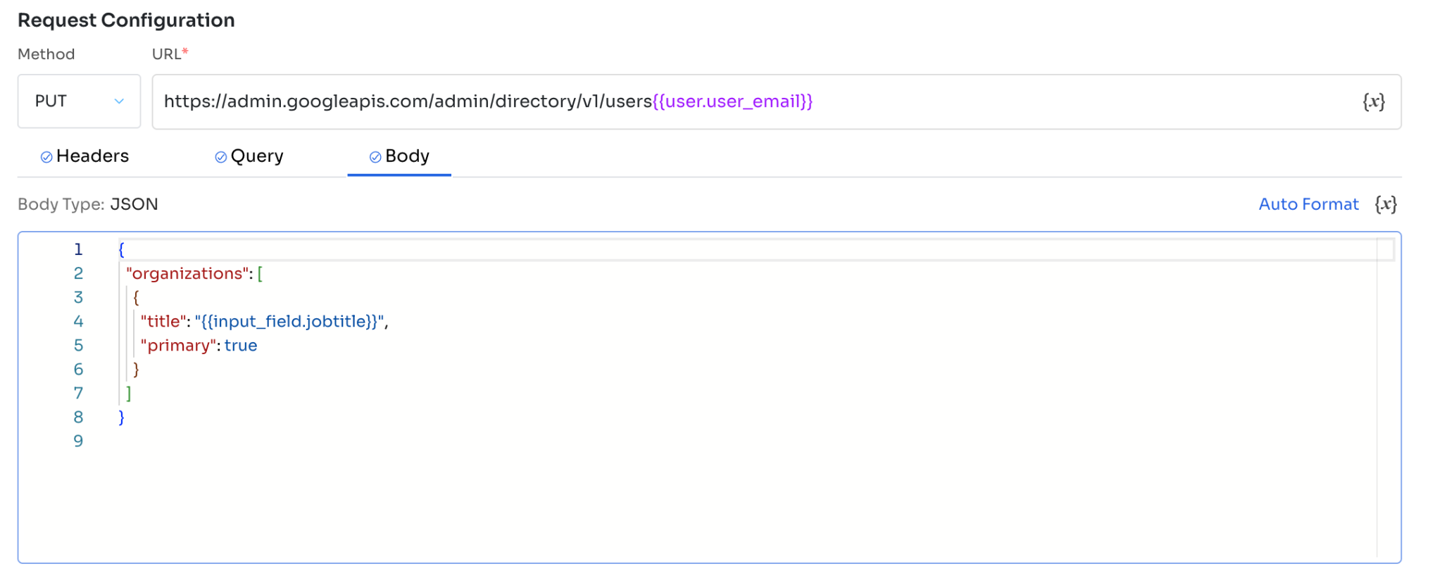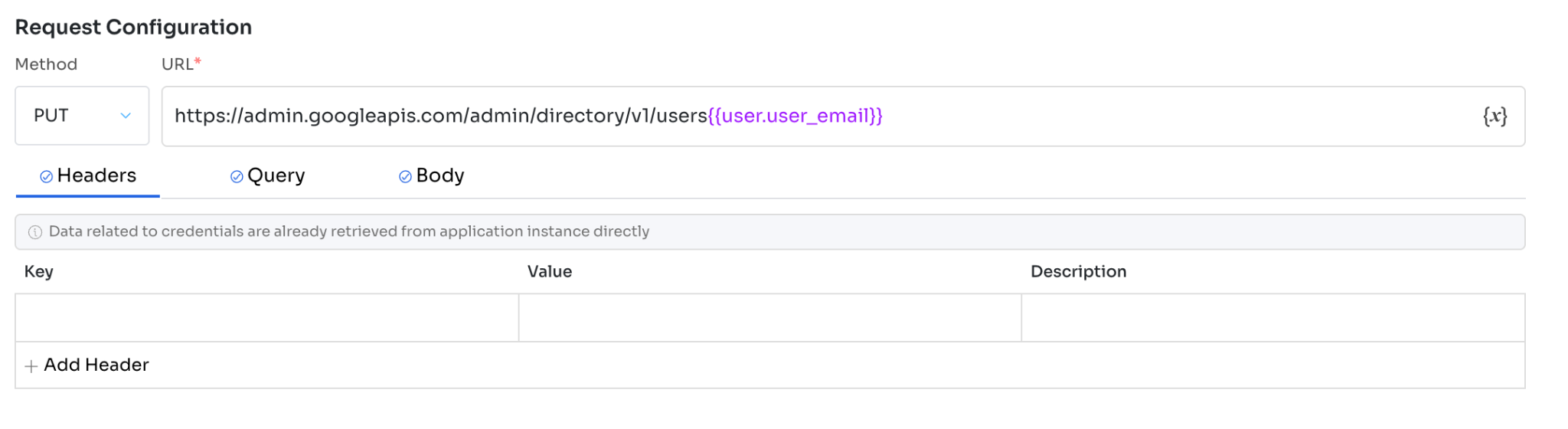 https://admin.googleapis.com/admin/directory/v1/users/{{user.user_email}}Headers**(Optional)**