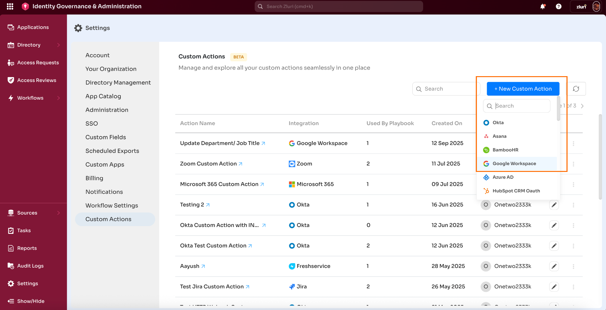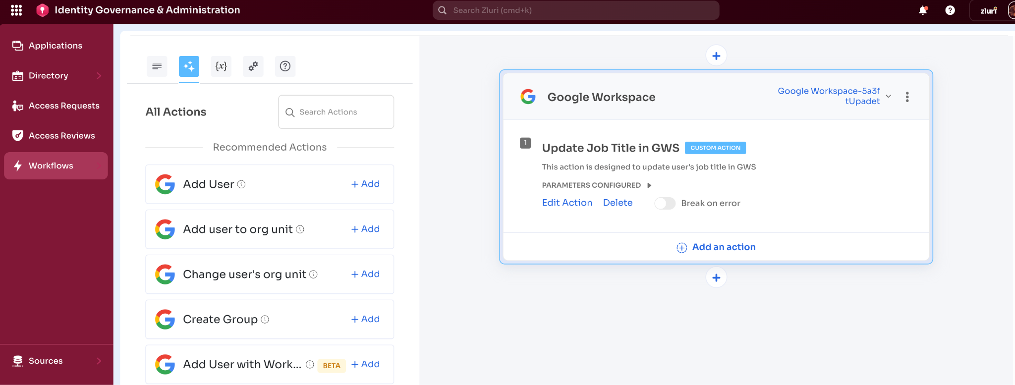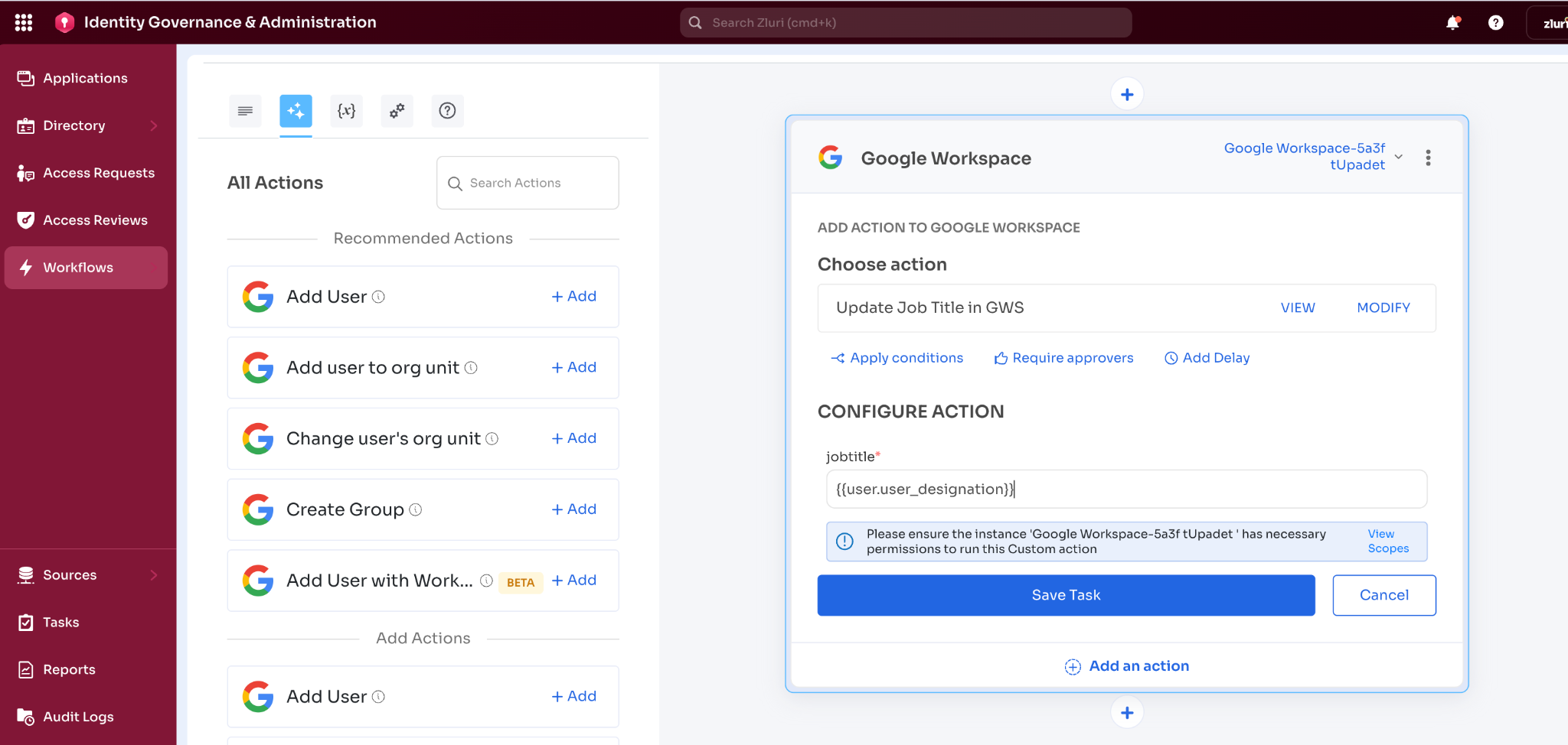 - Google Workspace integration connected in Zluri