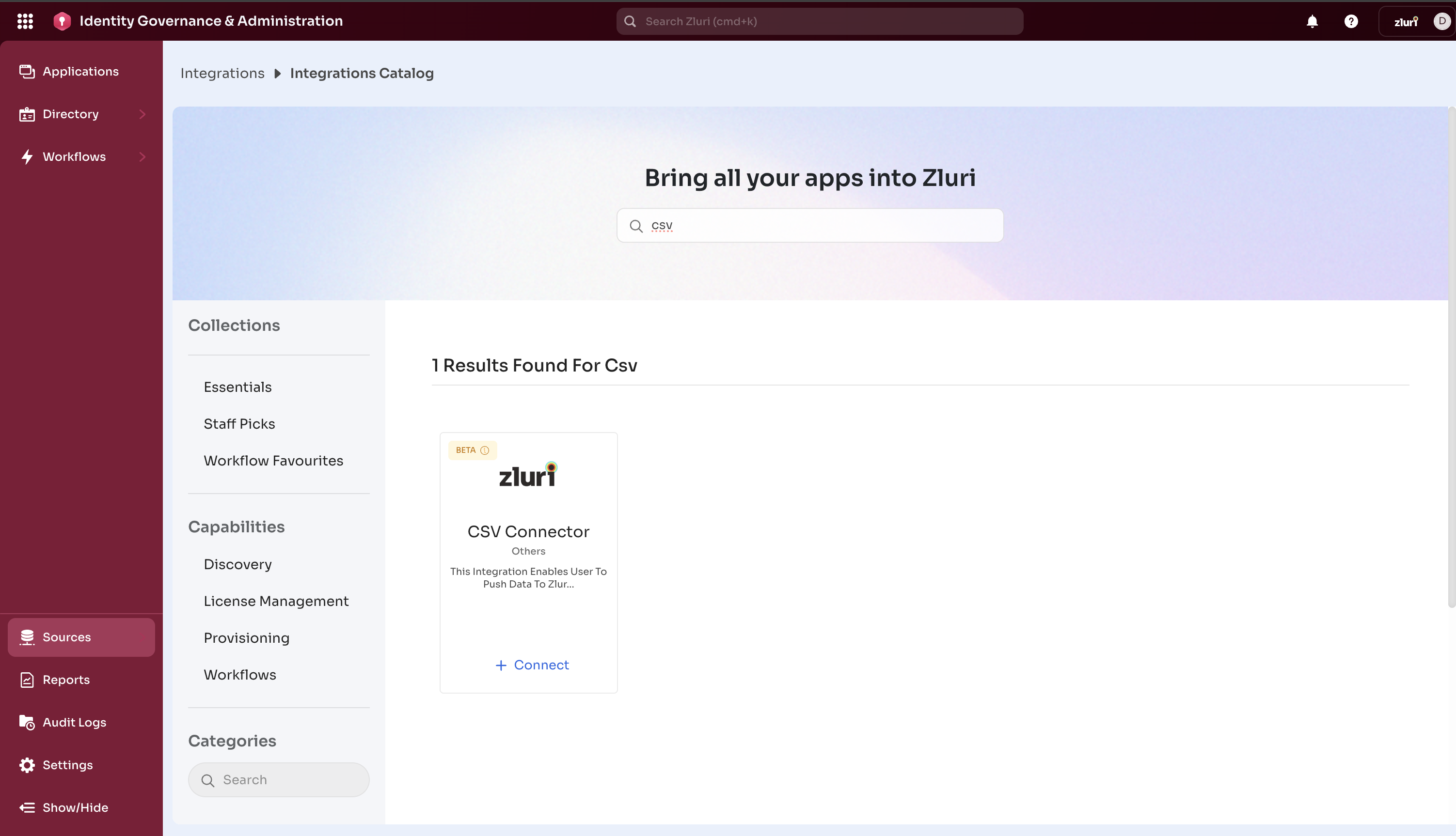 - Navigate to Sources > Integrations > Catalog > Search for CSV Connector