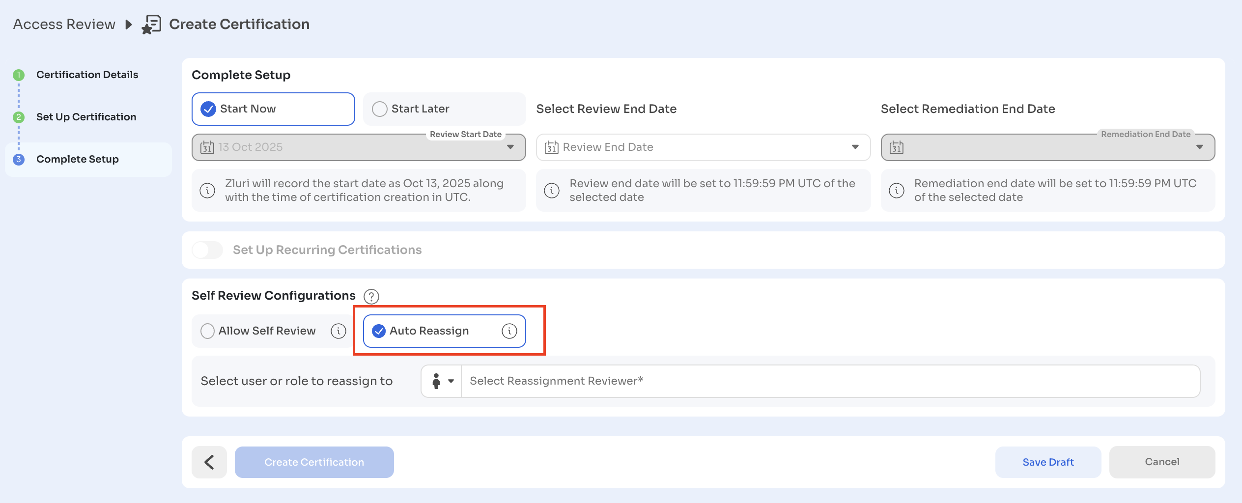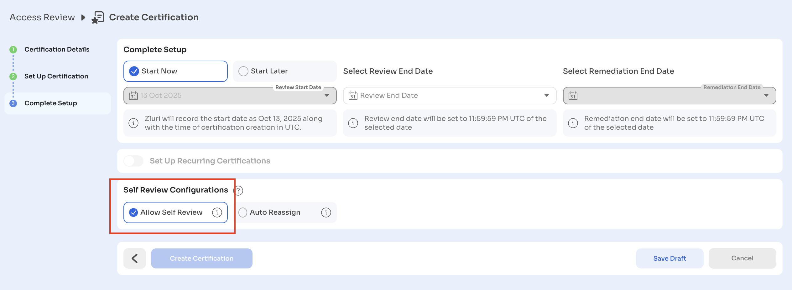 While creating a certification, Zluri allows admins to define how self-review scenarios are handled. Two options are available: