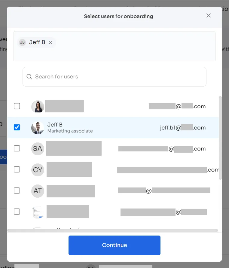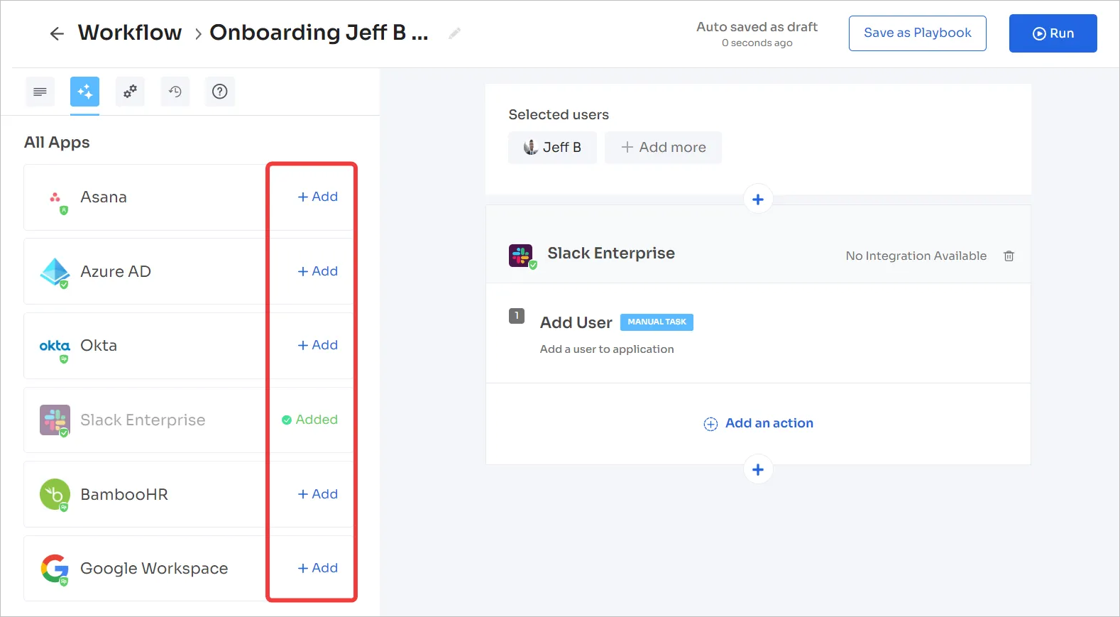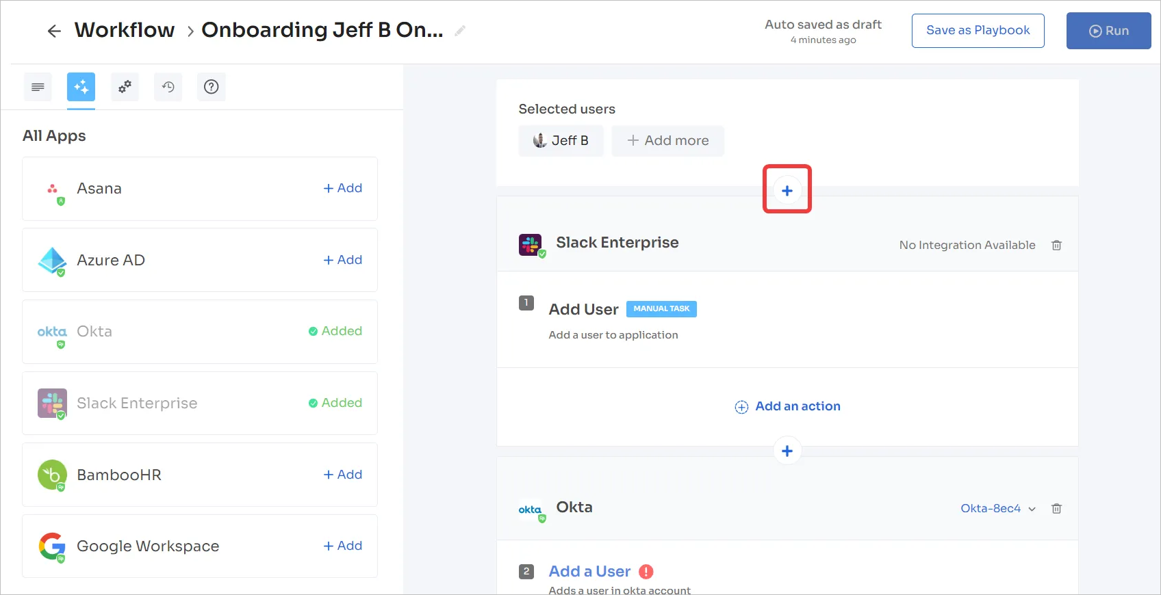 While creating an onboarding workflow, Zluri recommends a set of applications that your organization typically uses to onboard users. To access this, click the ➕ icon below the Selected users section.