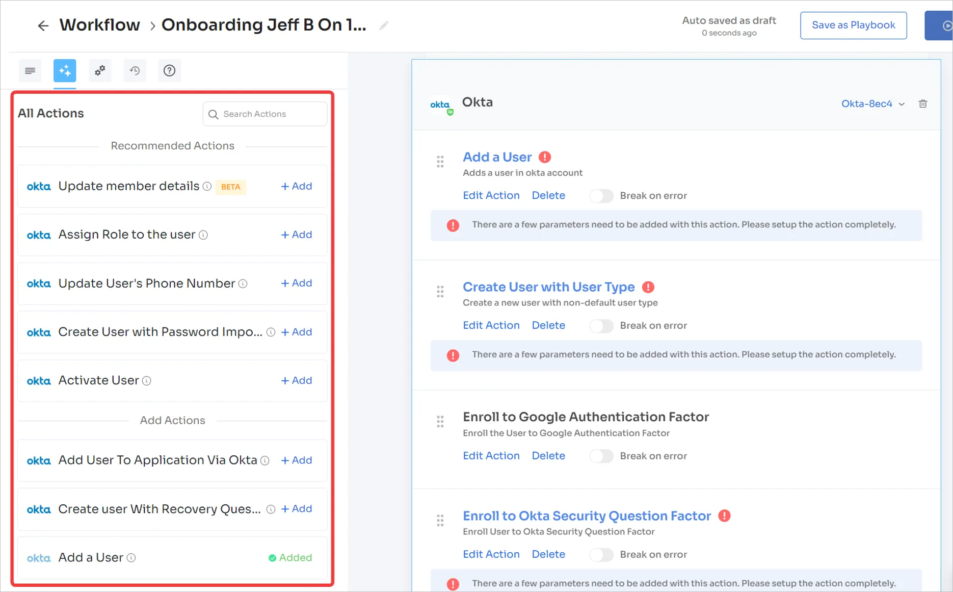 The actions marked with a red ❗ exclamation mark are mandatory to fill out. If not, or if there are errors in the workflow, Zluri saves it as an Unpublished playbook.
