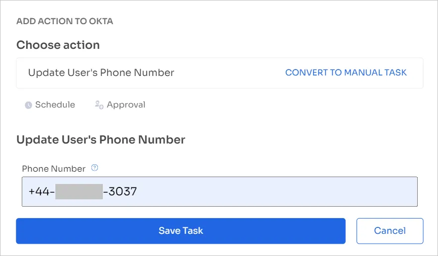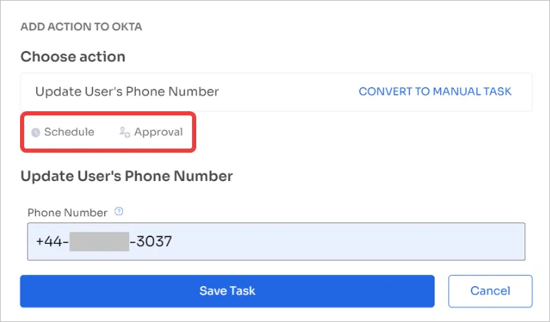 You can also use the Schedule and Approval options to add the number after a set time or have someone manually approve the onboarding respectively. Click Save Task after making your choices.