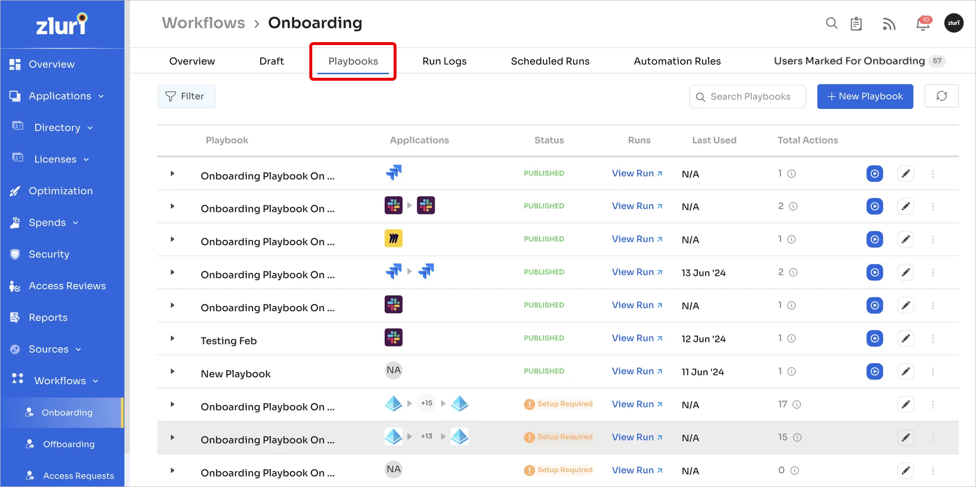 The Playbooks section contains saved workflows. Here, you can search, run, create, edit, or delete playbooks.
