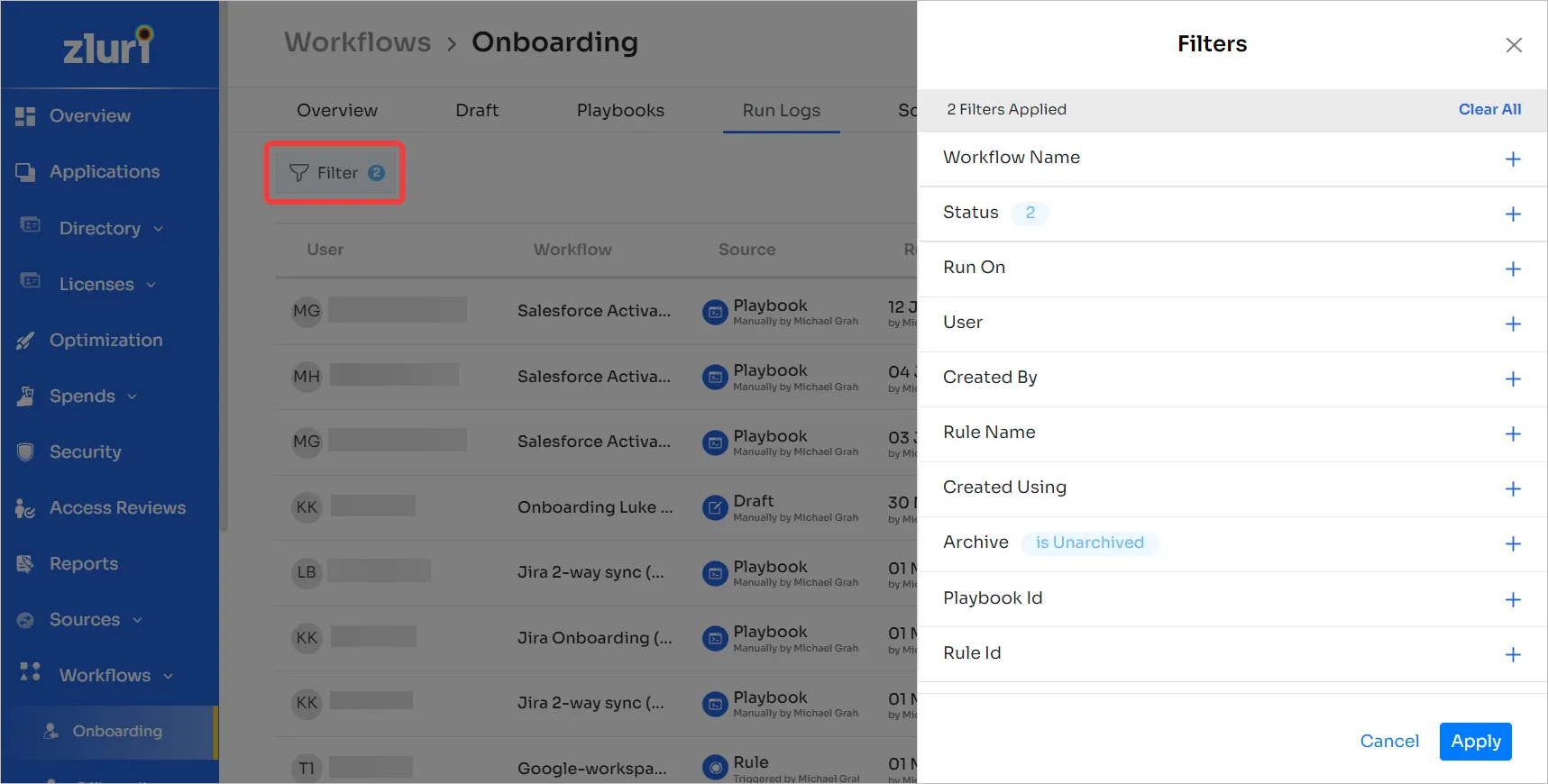The Run Logs section is a list of workflows that you’ve run. This includes completed, pending, and failed runs. You can search for workflows using the search bar, view logs, archive runs, or save them as playbooks.