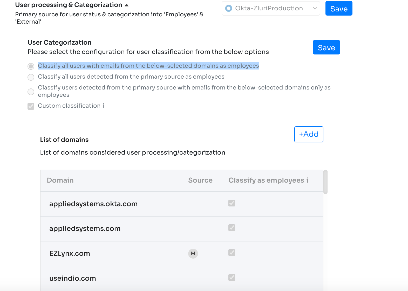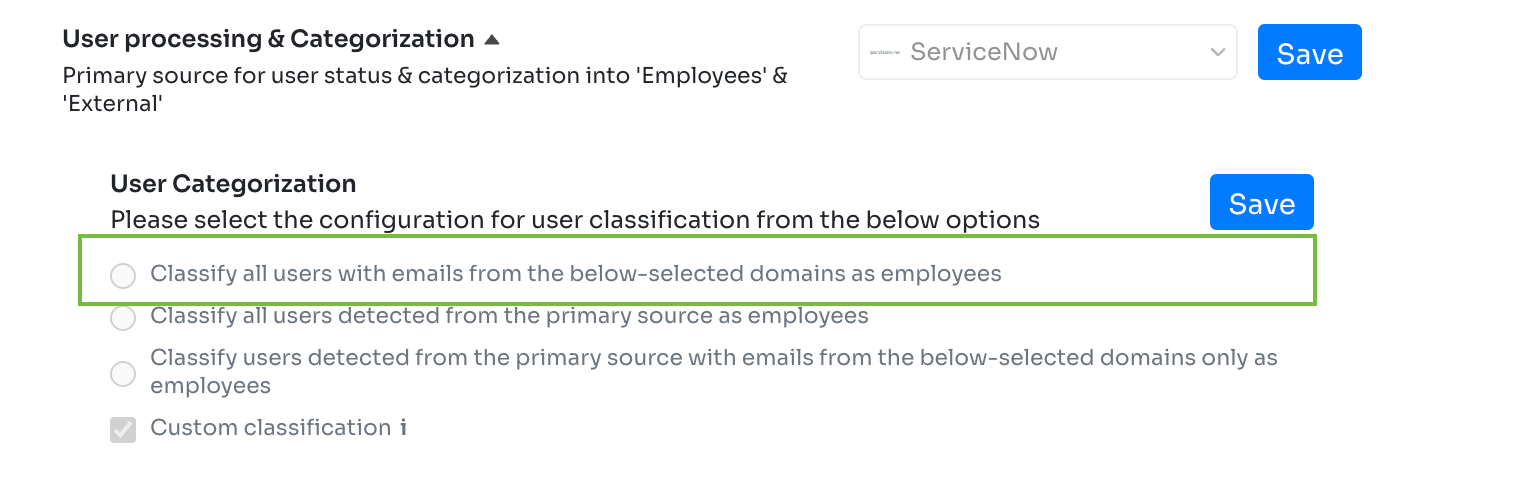 Employee / External categorisation is based on the selected Integration, selected Domains, or both.